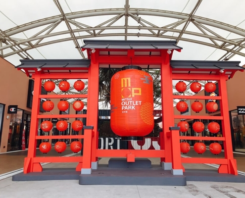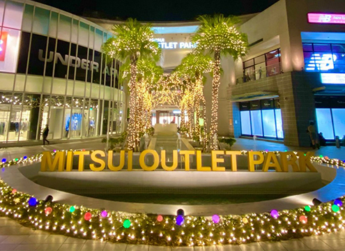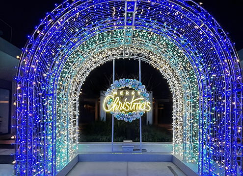 林口三井outlet聖誕布置燈飾工程 耘嵿設計團隊採用繽紛的色彩並運用多種燈具,將商城妝點成熱帶風格的聖誕節氛圍